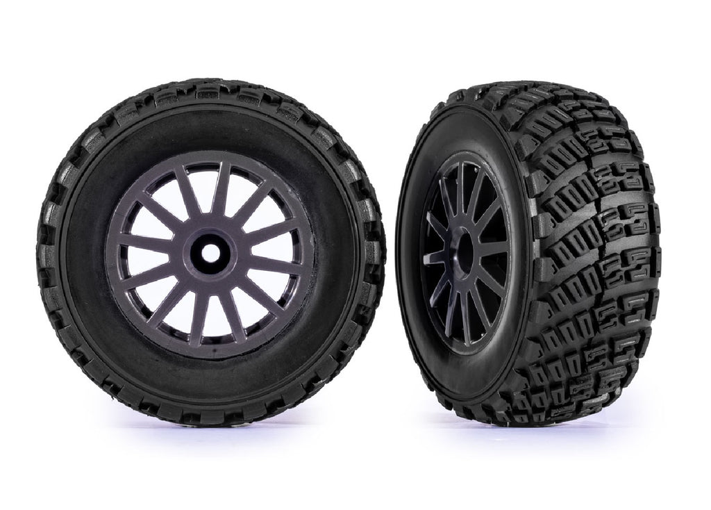 ラリータイヤは、独自の方向性トレッドパターンをハイグリップラバーに採用し、舗装路、ダート、砂利道など、あらゆる路面で優れたトラクションを発揮します。タイヤは接着済みで、フォームインサートが装着された状態でホワイトの12本スポークラリーホイールに取り付けられています。TSM®規格に準拠し、高速走行にも対応しています。(12mm六角穴付き、4WDフロントまたはリア、2WDリアのみ適合)