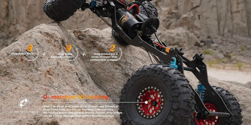 - 8ギアのドラッグブレーキフォースと9ギアのドラッグブレーキ加速調整により、より強力なランプパーキング機能を提供します。 最大ドラグブレーキ力は通常のブラシレスシステムより約2倍 異なるコントロール習慣を持つユーザーを満足させるために。